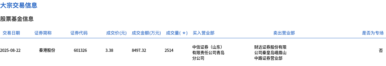 秦港股份今日大宗交易平价成交2514万股,成交额8497.32万元