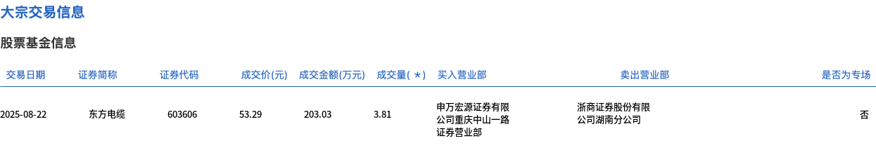 8月22日,东方电缆大宗交易成交3.81万股,成交额203.03万元,占当日总成交额的0.42%,成交价53.29元,较市场收盘价52.44元溢价1.62%。