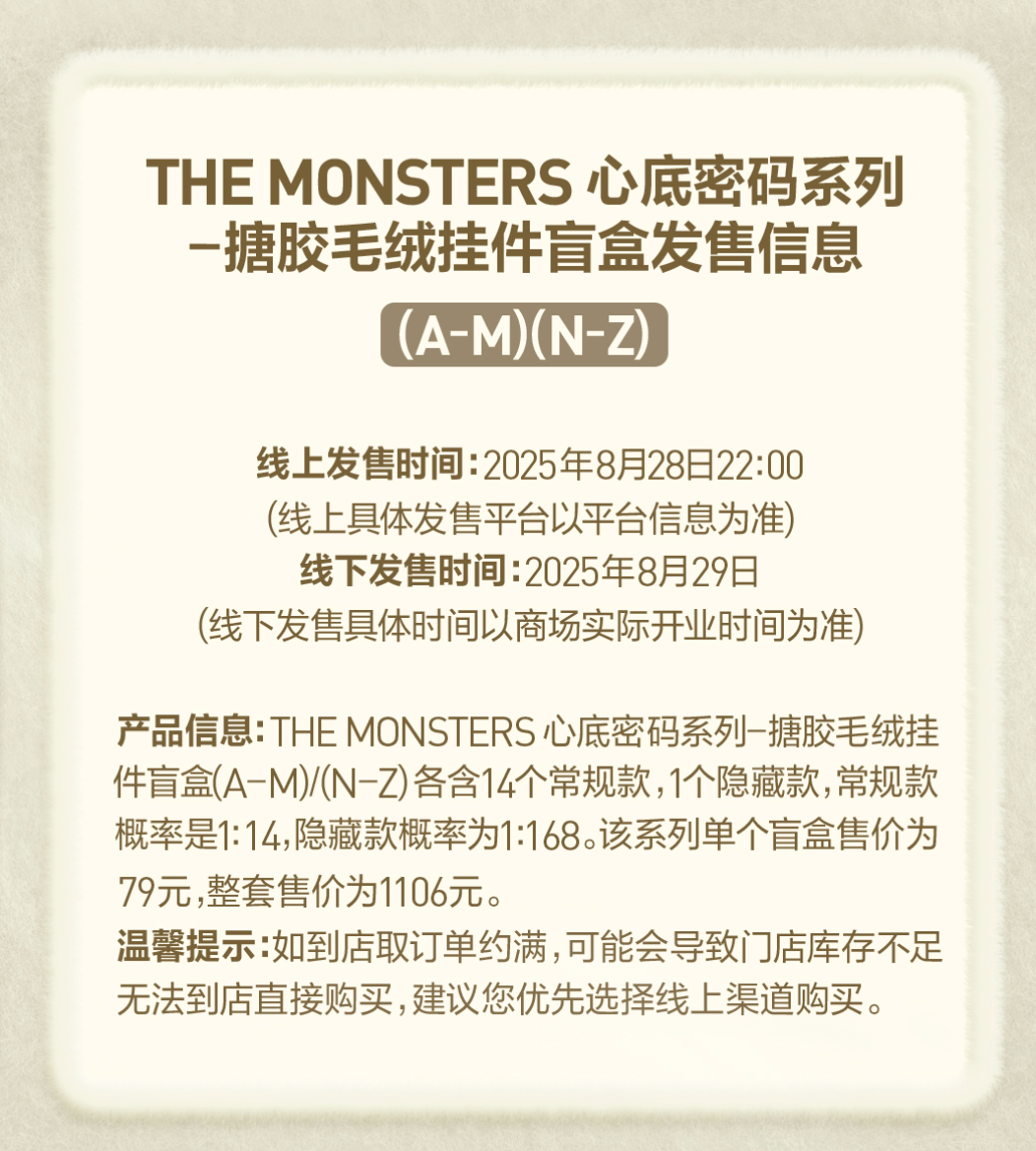 8月22日,泡泡玛特正式官宣mini版LABUBU新品,产品分为A/B两端,各含14个常规款,1个隐藏款,常规款概率为1:14,隐藏款概率为1:168。单个盲盒售价为79元,整套售价为1106元。新品线上发售时间为8月28日22:00,线下发售时间为8月29日。