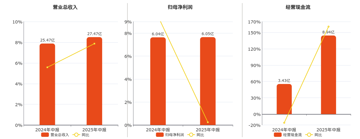 公司营业总收入为27.47亿元,较去年同报告期营业总收入增加2.00亿元,实现5年连续上涨,同比较去年同期上涨7.87%。归母净利润为6.05亿元,较去年同报告期归母净利润增加142.38万元,实现5年连续上涨,同比较去年同期上涨0.24%。经营活动现金净流入为8.94亿元,较去年同报告期经营活动现金净流入增加5.52亿元,同比较去年同期上涨160.85%。