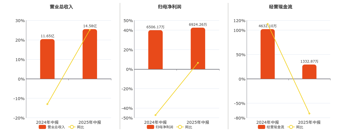公司营业总收入为14.58亿元,较去年同报告期营业总收入增加2.93亿元,同比较去年同期上涨25.15%。归母净利润为6924.26万元,较去年同报告期归母净利润增加418.09万元,同比较去年同期上涨6.43%。经营活动现金净流入为1332.87万元。