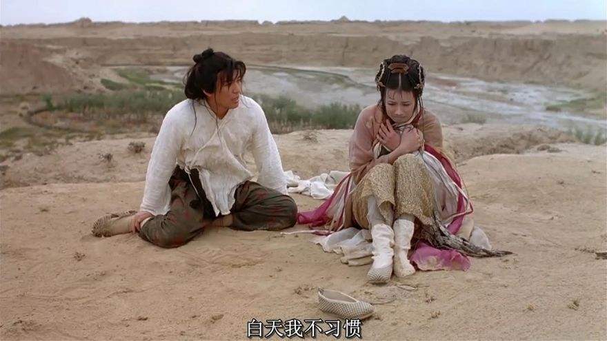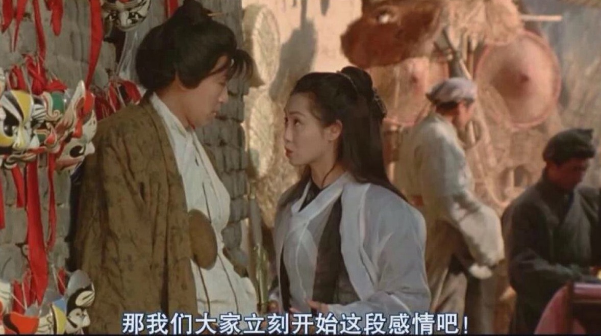 此时紫霞带着至尊宝去集市闲逛,然后故意问至尊宝该怎么面对意中人,在得到至尊宝的回答后紫霞吐露心声。这时至尊宝虽然不愿意接受,但是为了拿到月光宝盒他还是选择欺骗紫霞的感情,但却在两人即将接吻时凶狠地推开了紫霞,紫霞即刻露出了被伤害的眼神。而这段戏非常生活化的对话方式,包括至尊宝那个凶狠嫌弃的表情令我感到害怕,这不像是安排好的桥段,倒像是两人自己随性发挥的,这种真实与故事交织的演绎令人心有余悸。