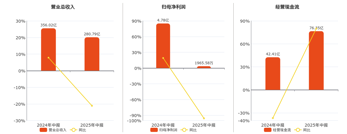 公司营业总收入为280.79亿元,较去年同报告期营业总收入减少83.87亿元,同比较去年同期下降23.00%。归母净利润为1965.58万元,较去年同报告期归母净利润减少4.87亿元,同比较去年同期下降96.12%。经营活动现金净流入为76.35亿元,较去年同报告期经营活动现金净流入增加32.14亿元,同比较去年同期上涨72.71%。