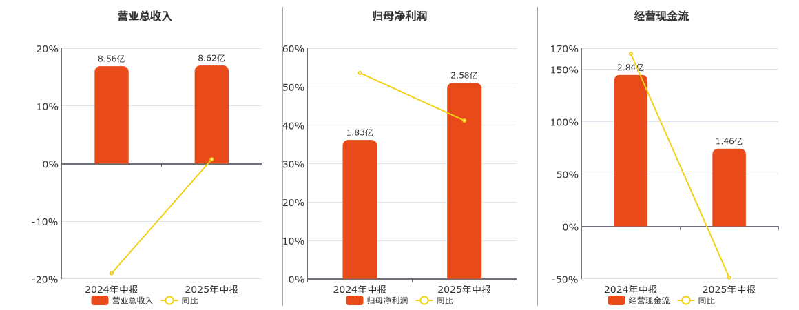 公司营业总收入为8.62亿元。归母净利润为2.58亿元。经营活动现金净流入为1.46亿元,较去年同报告期经营活动现金净流入减少1.38亿元,同比较去年同期下降48.68%。