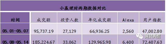小赢理财数据同样是成交额上升幅度最大,另外其Alexa涨势也较明显。