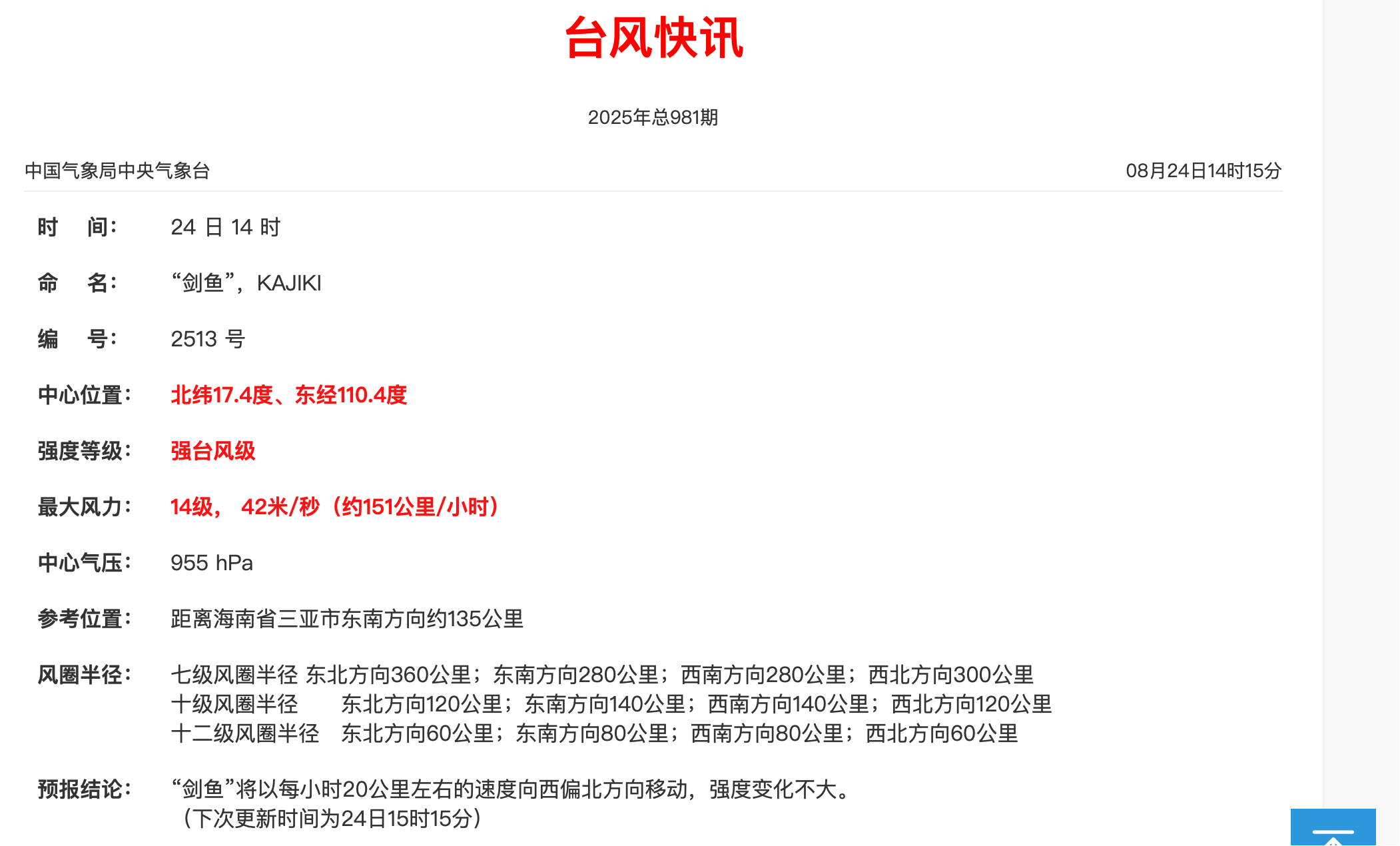 据中央气象台消息,8月24日14时,台风“剑鱼”已经加强为强台风级(14级,42米/秒),其中心位于海南省三亚市东南方向约135公里的海面上,预计“剑鱼”将以每小时20公里左右的速度向西偏北方向移动,强度变化不大。