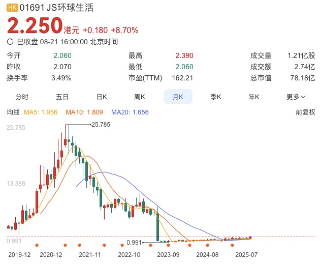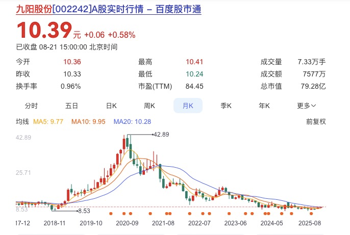 两家上市公司的股价也非常惨淡,九阳股份2020年高峰股价曾一度超过40元,此后一路下跌,2024年后股价一直在15元以下,8月21日报收于10.39元/股,市值仅为79.28亿元。JS环球生活上市后股价曾在2021年超过20港元,此后一路下跌,2023年6月后一直在2.5港元/股以下,8月21日收盘价为2.25港元/股,目前市值仅为78亿港元(约为71.5亿元)左右。