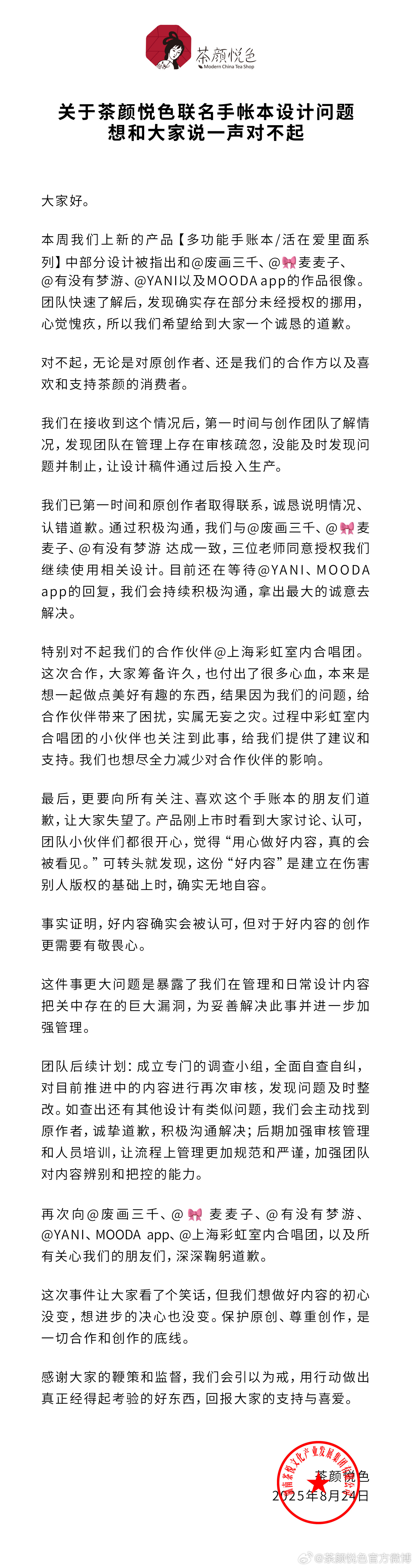 近日,多位博主先后在社交平台发文称,茶颜悦色与彩虹合唱团联名的手账本涉嫌抄袭其作品。对此,8月24日下午,茶颜悦色发文回应称,确实存在部分未经授权的挪用。团队在管理上存在审核疏忽,没能及时发现问题并制止,让设计稿件通过后投入生产。公司已第一时间和原创作者取得联系,诚恳说明情况,认错道歉。团队后续计划成立专门的调查小组,全面自查自纠,对目前推进中的内容进行再次审核,发现问题及时整改。