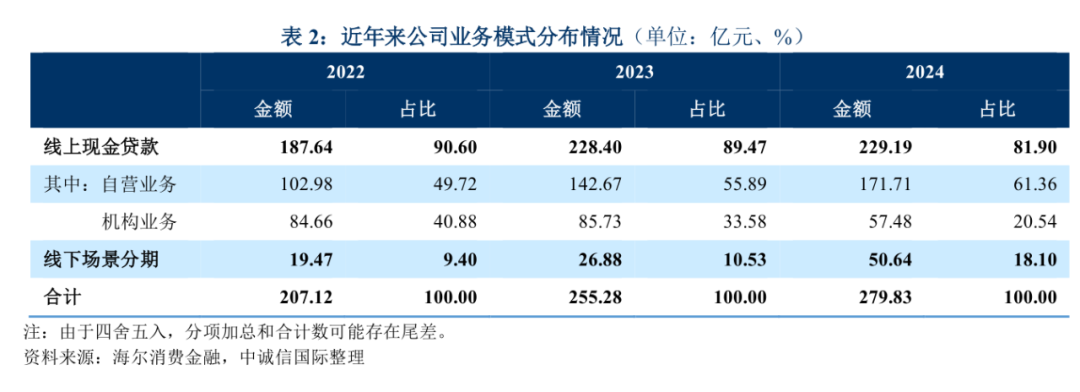 截至2024年末,公司现金贷自营业务达171.71亿元,占比达61.36%,线上及线下自营业务占比达79.46%,处于同业较好水平。