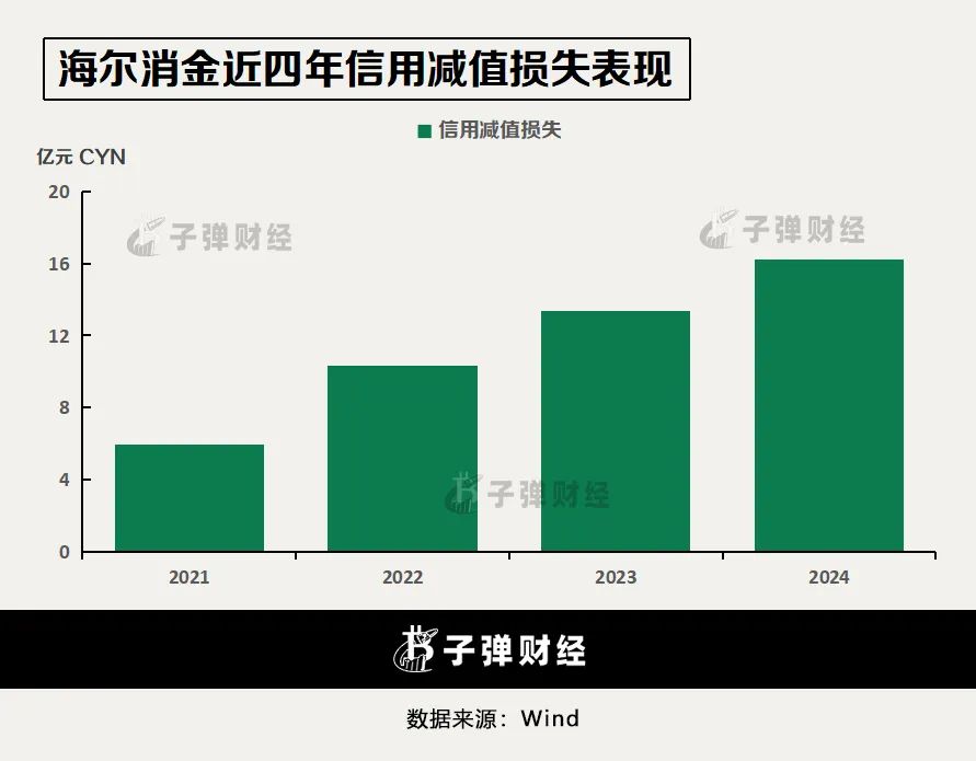 数据显示,2021年海尔消金的信用减值损失为5.96亿元,2022年末至2024年末分别攀升至10.3亿元、13.39亿元及16.25亿元,四年时间累计增长172.65%。