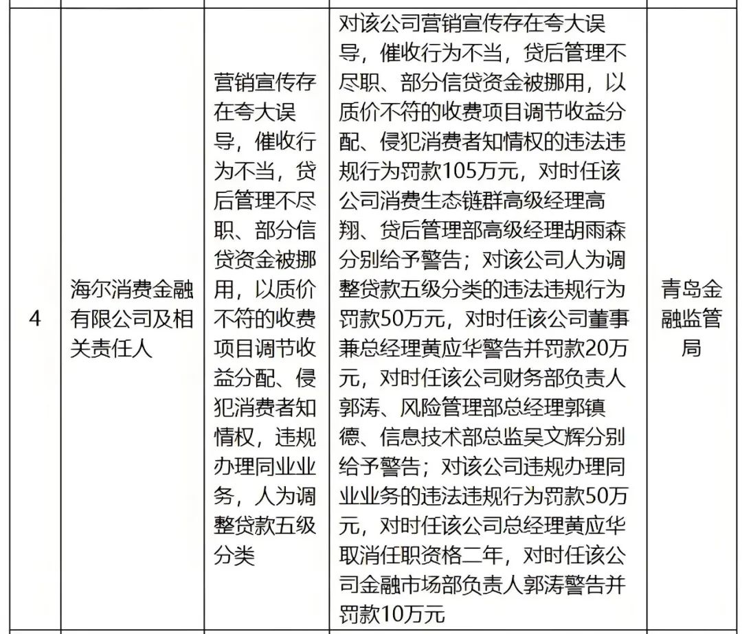 7月22日,青岛金融监管局披露的罚单显示,海尔消费金融因多项违法违规行为被合计罚款205万元。6名高管被警告、罚款。