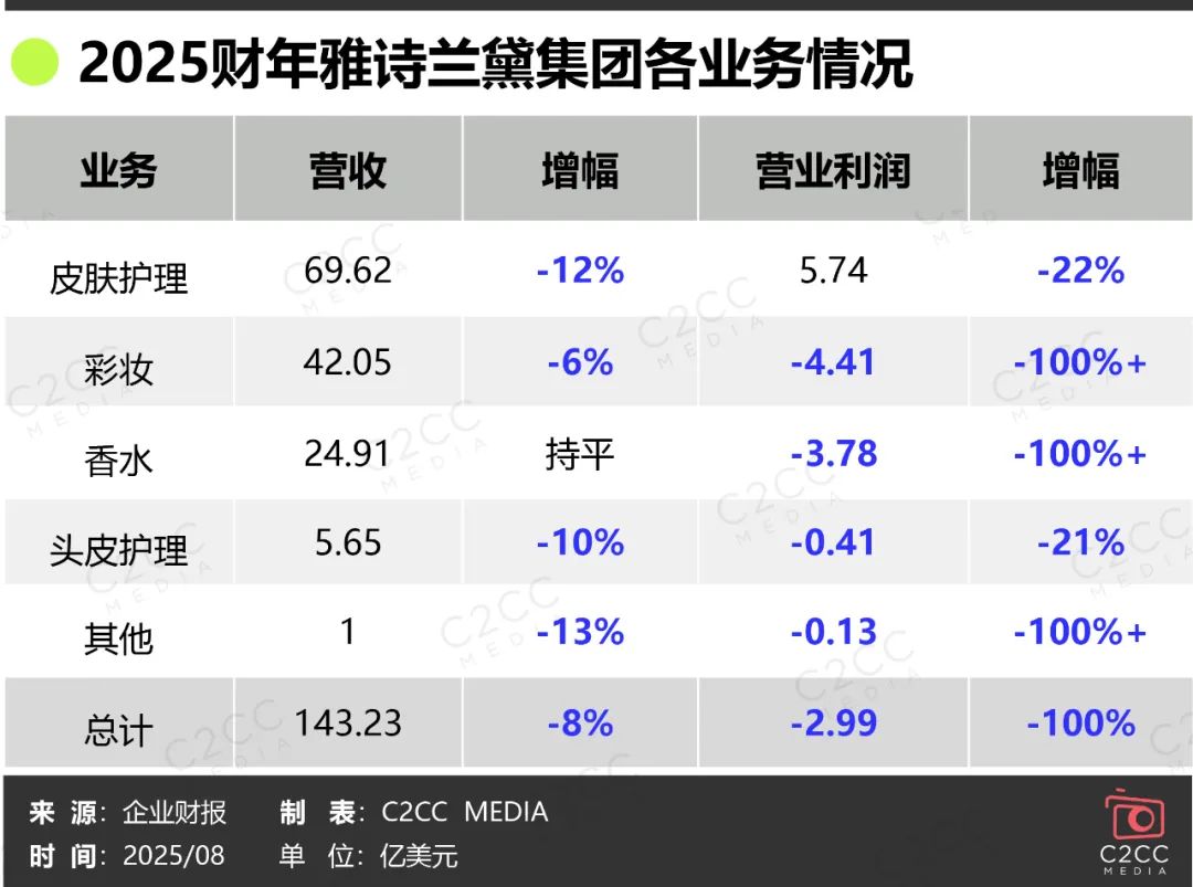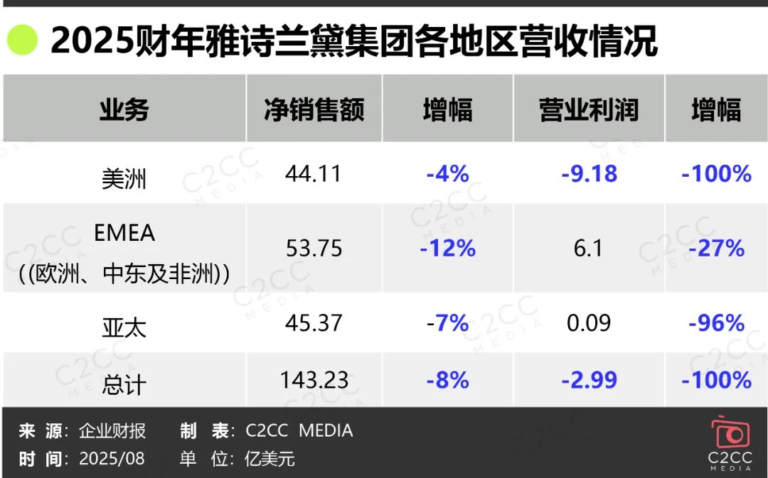 2025财年(2024年7月1日-2025年6月30日),雅诗兰黛集团净销售额143.26亿美元,同比下降8%,营业利润亏损7.85亿美元,呈现出腰斩式下滑。