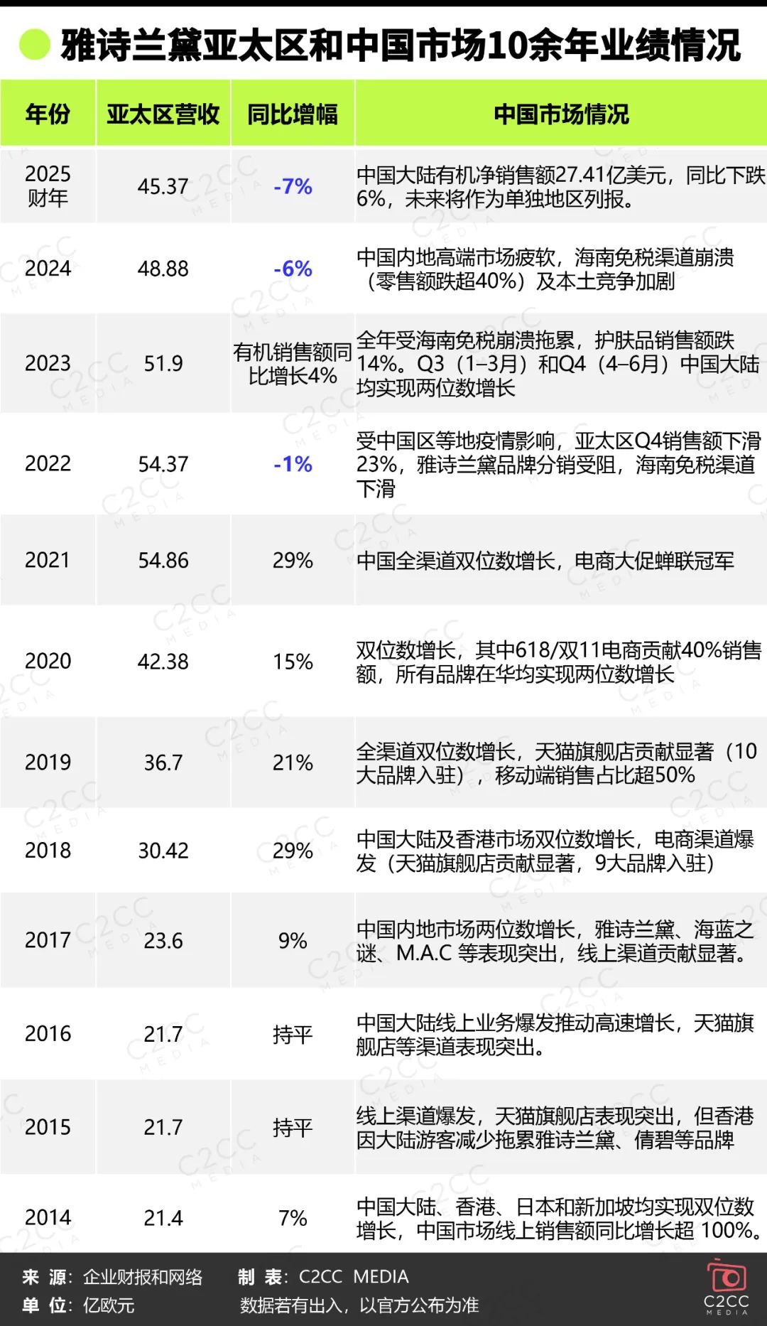 雅诗兰黛亚太区和中国市场十多年的业绩情况