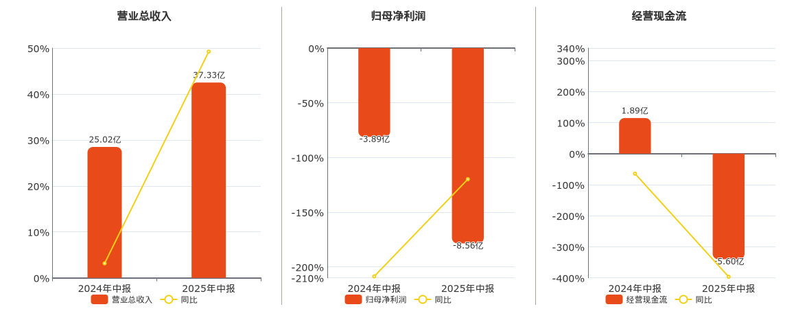公司营业总收入为37.33亿元,较去年同报告期营业总收入增加12.32亿元,实现3年连续上涨,同比较去年同期上涨49.23%。归母净利润为-8.56亿元。经营活动现金净流入为-5.60亿元。