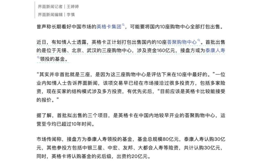 “界面新闻”近日援引知情人士透露,英格卡购物中心(Ingka Centres)正计划打包出售其在中国持有的全部10座荟聚购物中心。