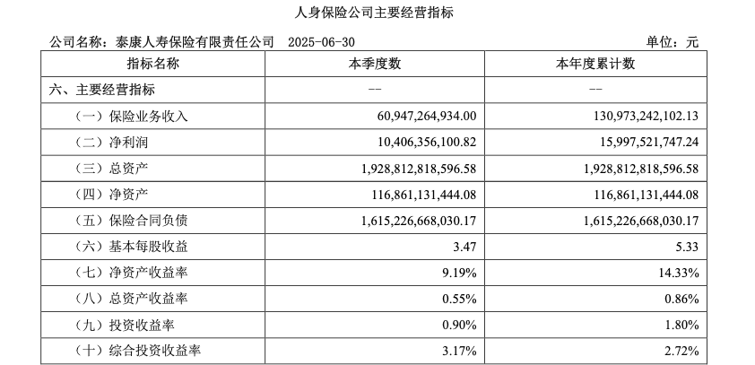 在此背景下,泰康人寿2025年上半年保险业务收入1309.73亿元,同比下滑5.84%;净利润达159.98亿元,较2024年上半年增加99.51亿元,同比增长164.56%,在非上市险企中排名第一,盈利能力显著提升。