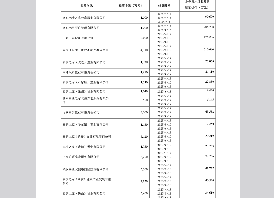 偿付能力报告则显示,泰康人寿2025年二季度已投资41家公司,投资标的包括多家置业、养老服务及医疗公司,其中“泰康之家”品牌企业众多。