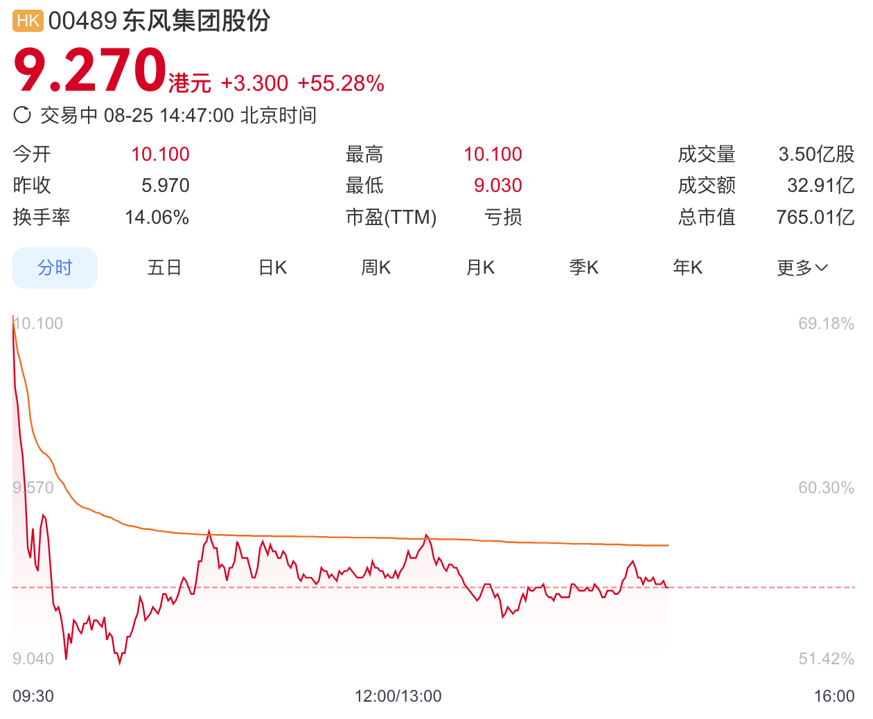 停牌十多天的东风集团股份复牌后股价飙涨。8月25日,东风集团股份(00489.HK)在港交所公告,上午9时起恢复买卖。港股开盘后,东风集团股份复牌高开近70%,截至发稿,涨55.28%,报9.270港元/股,最新市值765亿港元。
