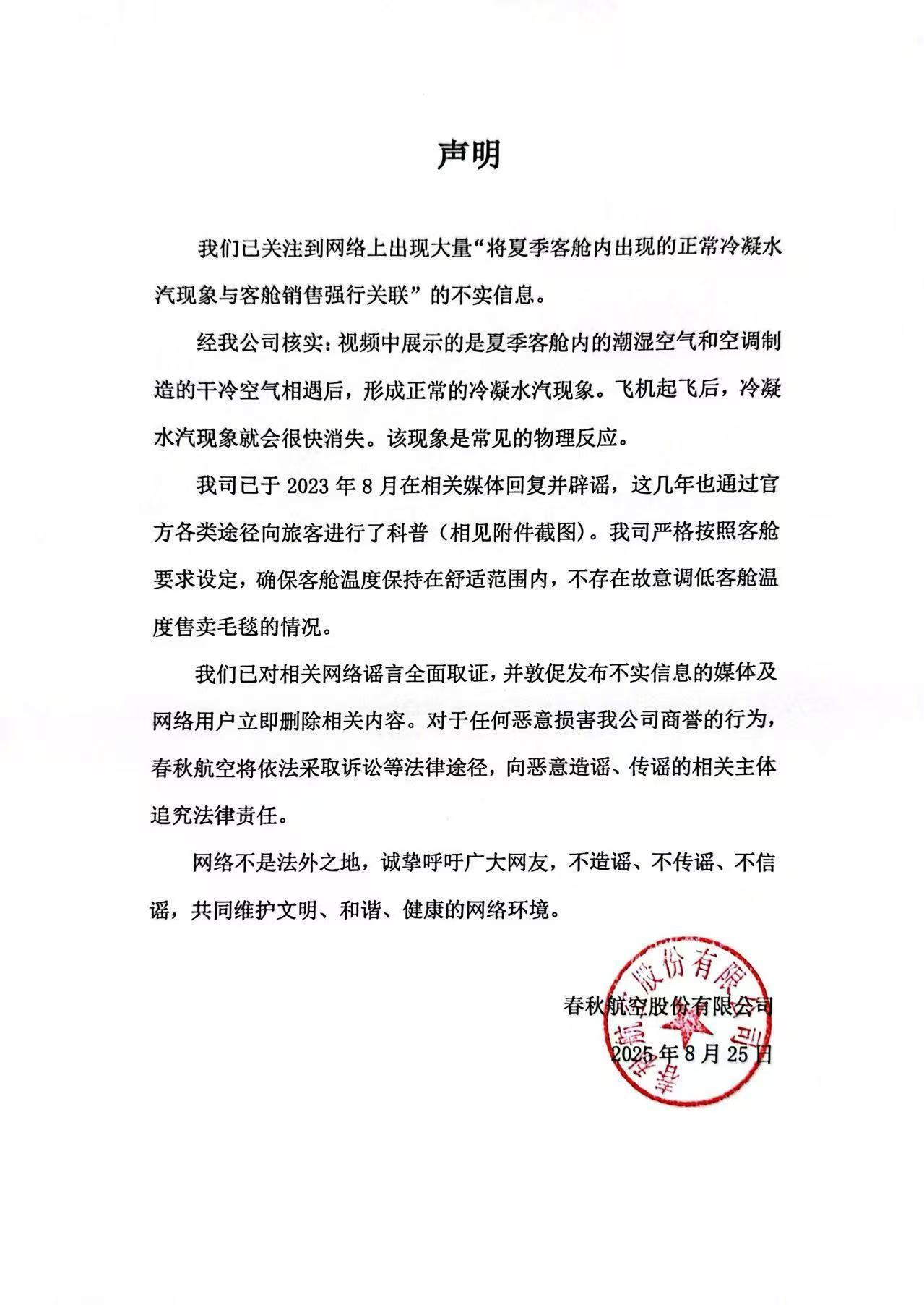 8月25日,春秋航空发布声明:公司关注到网络上出现大量“将夏季客舱内出现的正常冷凝水汽现象与客舱销售强行关联”的不实信息。经核实,视频中展示的是夏季客舱内的潮湿空气和空调制造的干冷空气相遇后,形成正常的冷凝水汽现象。飞机起飞后,冷凝水汽现象就会很快消失。该现象是常见的物理反应。公司已于2023年8月在相关媒体回复并辟谣,这几年也通过官方各类途径向旅客进行了科普。公司严格按照客舱要求设定,确保客舱温度保持在舒适范围内,不存在故意调低客舱温度售卖毛毯的情况。我们已对相关网络谣言全面取证,并敦促发布不实信息的媒体及网络用户立即删除相关内容。对于任何恶意损害我公司商誉的行为,春秋航空将依法采取诉讼等法律途径,向恶意造谣、传谣的相关主体追究法律责任。