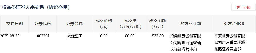 8月25日,大连重工大宗交易成交80万股,成交额532.8万元,占当日总成交额的1.05%,成交价6.66元,较市场收盘价6.65元溢价0.15%。