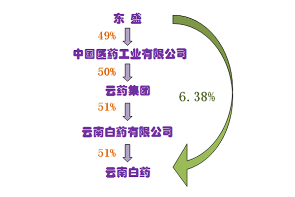 东盛先与国药集团组建中国医药工业公司,让自己拥有了“国企”身份,其中东盛占49%的股份,再由国药工业控股云药集团50%的股权,云药集团拥有云南白药有限公司51%的股权,而云南白药有限公司则占有上市公司云南白药51%的股权。