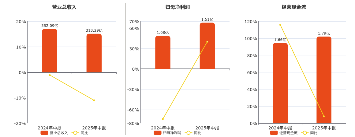 公司营业总收入为313.29亿元。归母净利润为1.51亿元,较去年同报告期归母净利润增加4323.17万元,同比较去年同期上涨39.99%。经营活动现金净流入为1.79亿元,较去年同报告期经营活动现金净流入增加1320.86万元,实现2年连续上涨,同比较去年同期上涨7.96%。