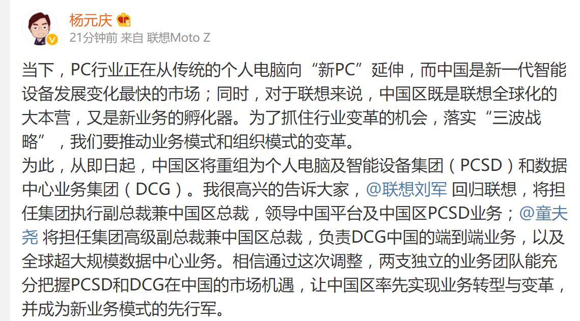 5月16日,联想集团董事长兼CEO杨元庆发微博宣布:“我很高兴的告诉大家,刘军回归联想,将担任集团执行副总裁兼中国区总裁,领导中国平台及中国区PCSD业务;童夫尧将担任集团高级副总裁兼中国区总裁,负责DCG中国的端到端业务,以及全球超大规模数据中心业务。”