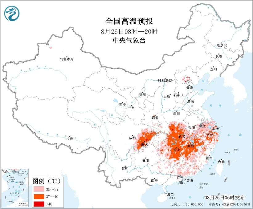 预计8月26日白天,四川东部、重庆、河南南部、湖北大部、湖南、江西、安徽中南部、江苏南部、浙江、上海、福建大部、广东北部、广西北部以及新疆吐鲁番盆地等地有35~39℃高温天气,其中,重庆中西部、湖北西南部、湖南东北部、江西北部、浙江中西部等地局地最高气温可超过40℃。