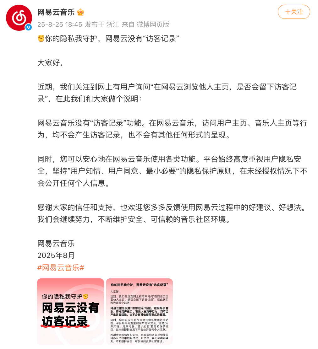 日前,@网易云音乐 发文称,网易云音乐没有“访客记录”功能。在网易云音乐,访问用户主页、音乐人主页等行为,均不会产生访客记录,也不会有其他任何形式的呈现。平台始终高度重视用户隐私安全,坚持”用户知情、用户同意、最小必要“的隐私保护原则,在未经授权情况下不会公开任何个人信息。