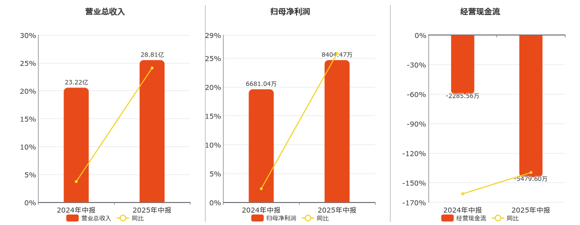 公司营业总收入为28.81亿元。归母净利润为8404.47万元。经营活动现金净流入为-5479.60万元,较去年同报告期经营活动现金净流入减少3194.05万元。