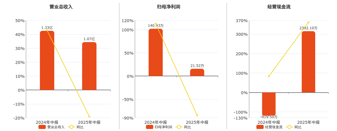 公司营业总收入为1.07亿元,较去年同报告期营业总收入减少2531.34万元,同比较去年同期下降19.07%。归母净利润为21.52万元,较去年同报告期归母净利润减少118.91万元,同比较去年同期下降84.68%。经营活动现金净流入为2392.10万元,较去年同报告期经营活动现金净流入增加3311.60万元,实现2年连续上涨。