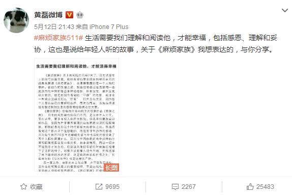 5月12日,黄磊在个人微博上发表了一篇满怀心声与涉及大量剧透的长微博《生活需要我们理解和阅读他,才能活得幸福》。