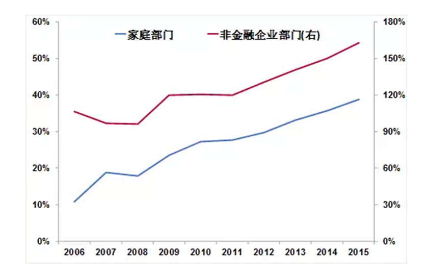图表5:中国家庭部门和非金融企业部门杠杆率走势