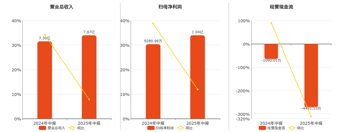 公司营业总收入为7.87亿元,较去年同报告期营业总收入增加5713.50万元,实现5年连续上涨,同比较去年同期上涨7.83%。归母净利润为1.04亿元,较去年同报告期归母净利润增加1107.57万元,实现2年连续上涨,同比较去年同期上涨11.93%。经营活动现金净流入为-4481.13万元。