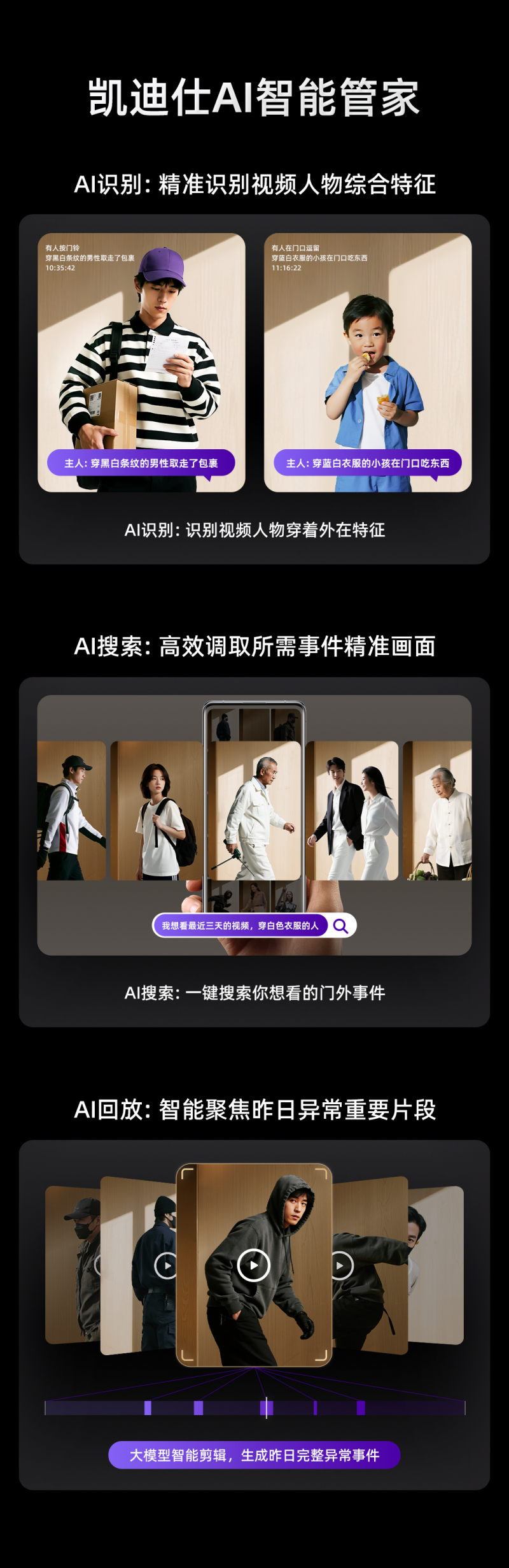 依托AI的自动学习与视频处理能力,凯迪仕还引入AI智能剪辑助手功能,能够自动提取视频关键特征,生成事件摘要,节省用户90%检索时间,无需手动翻查,极大提升信息处理效率与使用体验。