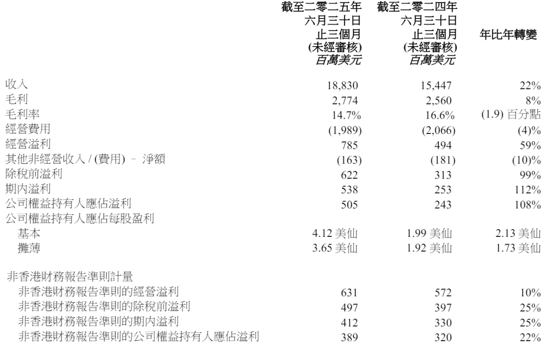 联想的财报印证了这一观点。近期公布的2025至2026财年第一季度财报显示,联想集团收入同比增长22%至188亿美元,净利润则同比增长108%至5.05亿美元。
