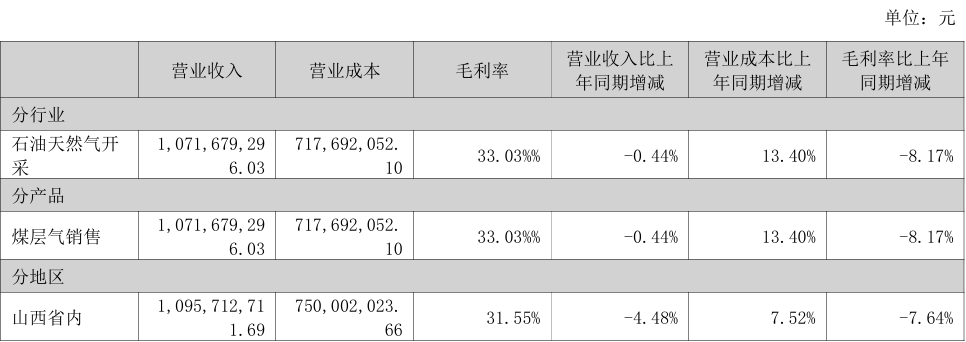 从产业结构来看,蓝焰控股主要从事石油天然气开采行业,营业收入为10.72亿元,相较上年同期减少0.44%;从产品来看,蓝焰控股主要营业产品为煤层气销售,报告期内营收10.72亿元,同比减少0.44;分地区来看,蓝焰控股业务主要面向山西省内,本期营收为109.57亿元,比2024年上半年降低4.48%。