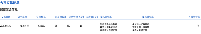 8月26日,泰坦科技大宗交易成交10万股,成交额250万元,占当日总成交额的1.57%,成交价25元,较市场收盘价29.41元折价14.99%。