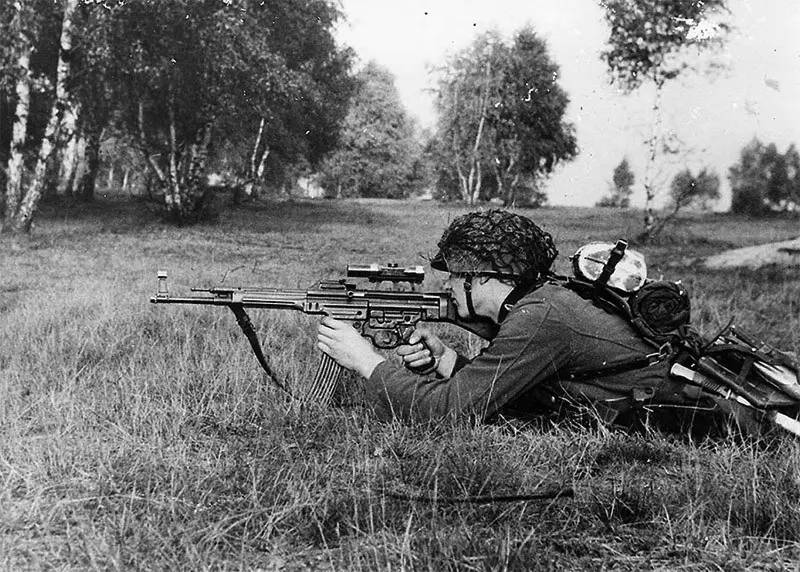 但是它的出现并不能阻止德国的整体溃败,到战争结束时该枪仅产量40万支,所以Stg44没有普遍装备德军,但在重建的44年装甲旅中,该枪曾普遍装备于德国士兵,因此在相关战役中对西线同盟国士兵带来不小震撼。