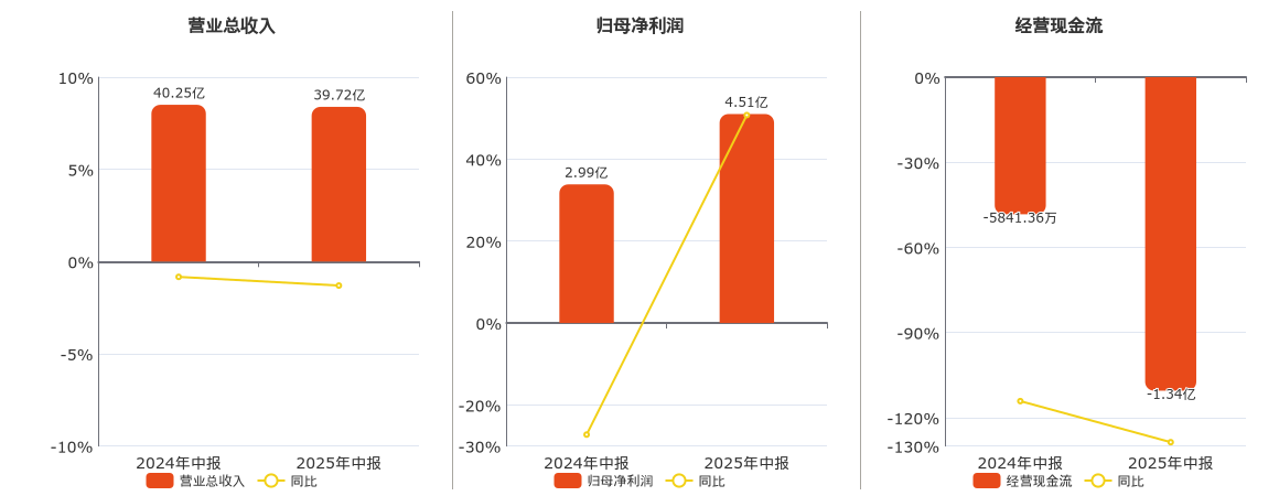 公司营业总收入为39.72亿元。归母净利润为4.51亿元,较去年同报告期归母净利润增加1.52亿元,同比较去年同期上涨50.74%。经营活动现金净流入为-1.34亿元。