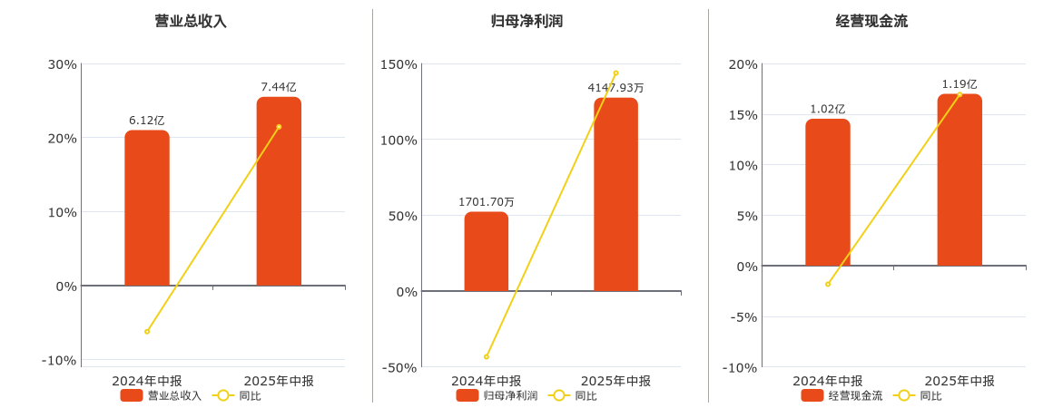 公司营业总收入为7.44亿元。归母净利润为4147.93万元。经营活动现金净流入为1.19亿元。