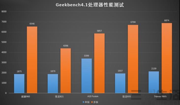 GeekBench和安兔兔等主流跑分软件的成绩中,骁龙835单核跑分在1900分出头,多核成绩6700+,而Exynos 8895略强,单核有2100分出头,多核6800+。虽然这两颗处理器的多核成绩确实相比骁龙821高出50%左右,但是单核成绩竟然没什么长进,最让人意外的是,这两颗最新旗舰的跑分和去年发布的华为海思麒麟960处于同一水准!