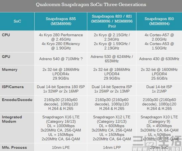 在架构方面,之前骁龙的每次升级,几乎都伴随着架构的大幅提升:骁龙800的Krait架构(和ARM®Cortex™A53同级别)提升到骁龙810的ARM®Cortex™A57架构,而骁龙820使用了比ARM®Cortex™ A73还强的Kyro架构,可谓每一次都是大跨步升级。