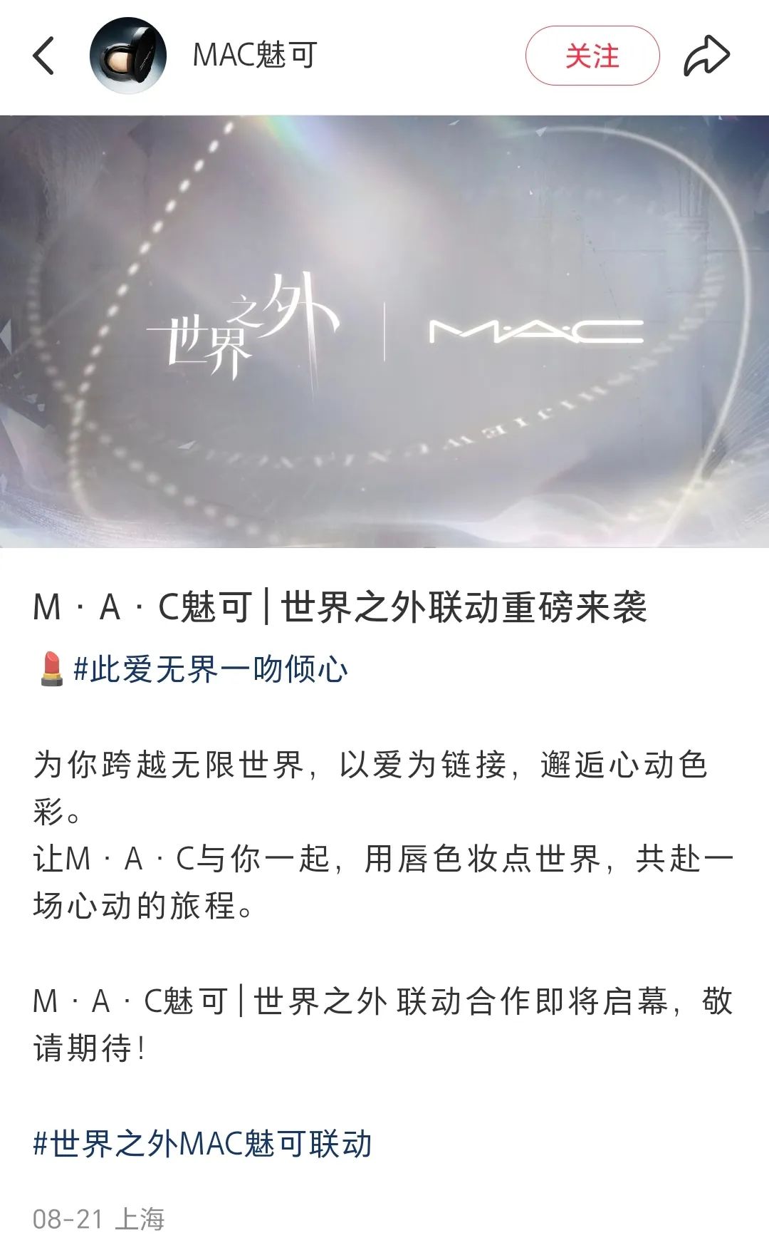 同时,由于联名的不熟练,在合作圈层IP时,美妆品牌频频翻车。7月蜜丝婷与《光与夜之恋》的联名,MAC刚刚官宣与《世界之外》的联名,均因为联动方式、联动物料引发巨大争议。其中MAC具体联名品还未发布,便遭遇了大量《世界之外》玩家的大范围抵制。