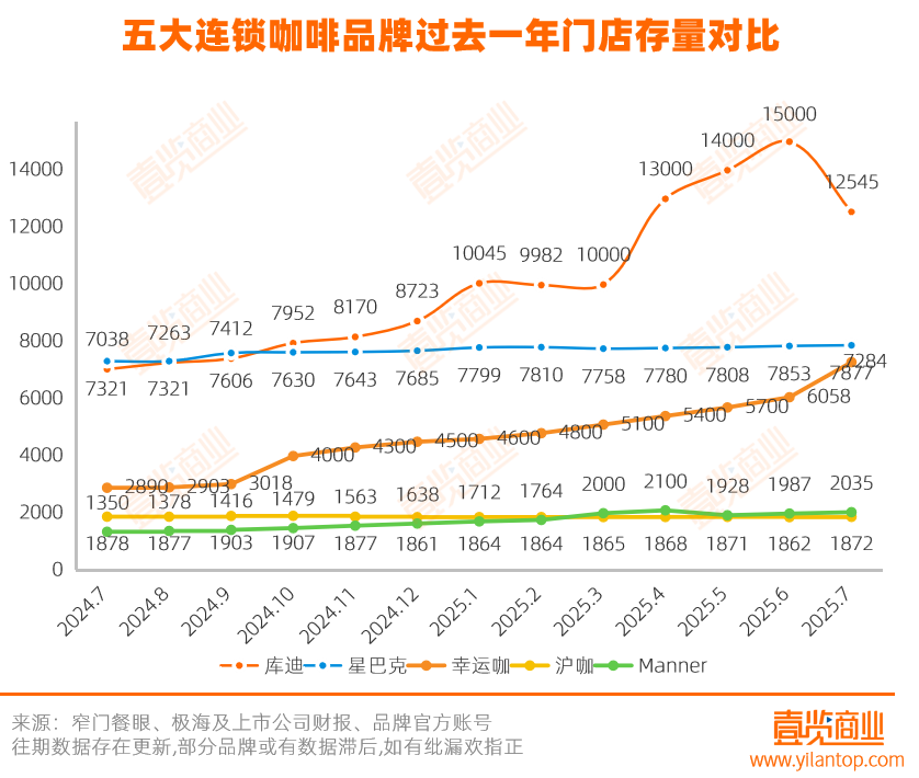 幸运咖近一年增长非常迅猛,门店数量从两千多家一路飙升至七千多家,增长率超过160%,按此增速,门店存量不日便将超过星巴克。品牌近期还调整策略,开始重点进军一二线城市,并设定了2025年门店数量突破1万家的目标。