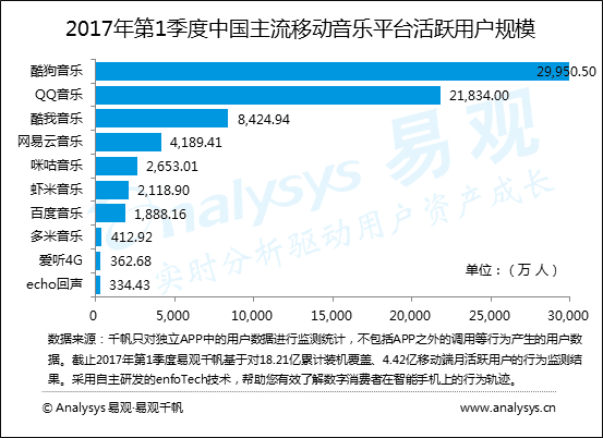 毫无疑问,腾讯音乐娱乐集团借助对中国音乐集团的收购完成了对国内音乐市场的压倒性胜利,成功实现“超级崛起”。根据Analysys易观发布的《中国移动音乐市场季度监测分析2017年第1季度》数据显示, 2017年第1季度中国主流移动音乐平台的前三名被腾讯音乐娱乐集团旗下三款应用牢牢占据,不考虑用户重合因素,酷狗音乐、QQ音乐、酷我音乐的月活用户超过6亿。