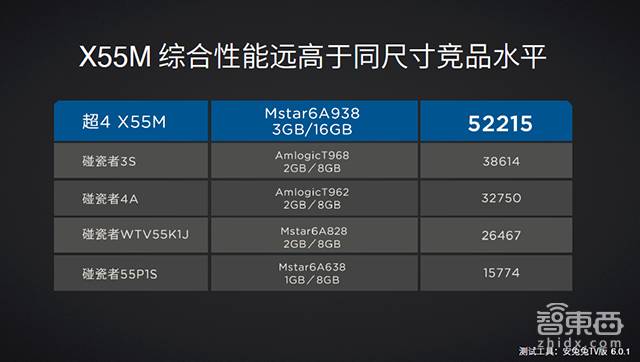 最后,作为乐视“4U”发布会的压轴产品——55吋超4 X55M,梁军称其是一款“共享电视”。在其配置上,X55M采用全局动态背光2.0、配置1.3倍行业密度LED背光灯、采用高精密丝印技术光学料件、以及9倍于行业标准的81点均匀性测试、炫彩图像等技术。X55M采用Mstar6A938处理器,3GB+16GB存储配置(生态版4GB+16GB),并标配智能语音遥控器和支持声纹识别。据安兔兔TV版显示,其以52215的跑分远远领先与其他竞品。其价格为3699元。