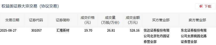 8月27日,汇隆新材大宗交易成交26.81万股,成交额528.16万元,占当日总成交额的4.53%,成交价19.7元,较市场收盘价23.52元折价16.24%。