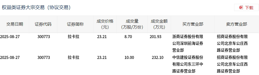 8月27日,拉卡拉大宗交易成交18.7万股,成交额434.03万元,占当日总成交额的0.24%,成交价23.21元,较市场收盘价28元折价17.11%。