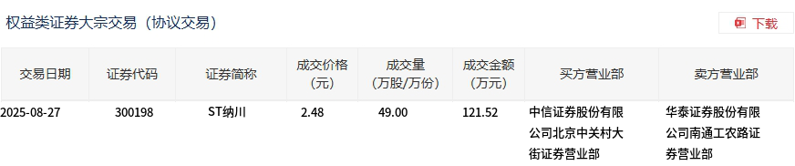 ST纳川今日大宗交易平价成交49万股,成交额121.52万元